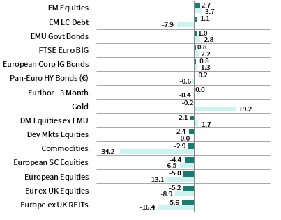 Real assets and developed markets equities declined the most in October. European stocks underperformed broader developed equivalents, while European small caps topped large caps. Emerging markets equities were the only main equity category to advance. Safe-haven gold declined despite equity market turbulence.