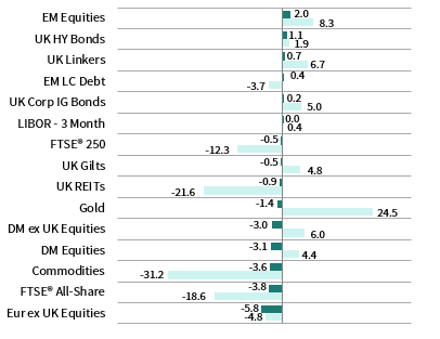 Gold and UK Gilts both declined, offering little respite to investors amid near record high prices and ultralow yields. UK high-yield and investment-grade corporate bonds gained, while UK linkers also outperformed nominal Gilts.