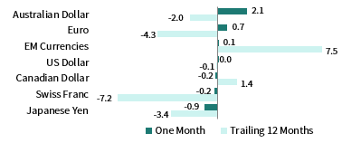US dollar performance was mixed. The greenback appreciated the most versus the Australian dollar and euro, but declined the most against the safe-haven Japanese yen and Swiss franc. The US dollar mostly declined over the past year, falling the most versus the Swiss franc and euro, but gaining significantly versus an equal-weighted basket of emerging markets currencies.