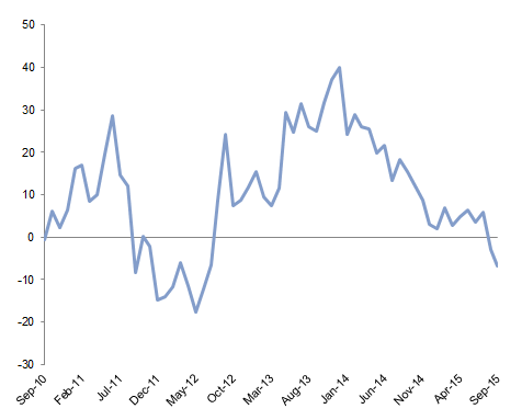 Emerging markets equities (-12.0%) gave back all of their prior calendar year gains and more by quarter end, while international investors saw even larger losses on unhedged exposures as emerging markets currencies remained under pressure. The third quarter sell-off was in part driven by the stock market correction in China (-22.7% offshore and -28.8% onshore); markets with strong trade ties to China also suffered. Meanwhile, unfolding crises in other emerging markets like Brazil are at risk of being overlooked amid the focus on China. Brazil’s recent sovereign debt downgrade and currency collapse exemplify the challenges faced by many emerging economies. Entrenched political interests have prevented policymakers from smoothly facilitating their adjustment to lower commodity prices and declining foreign investor interest in the emerging markets carry trade. South Africa and Turkey offer similar examples. In contrast, China arguably possesses greater policy room and political will to pursue reforms than some of the so called “Fragile Five” countries as evidenced by the recent government stimulus measures to boost auto and housing demand.