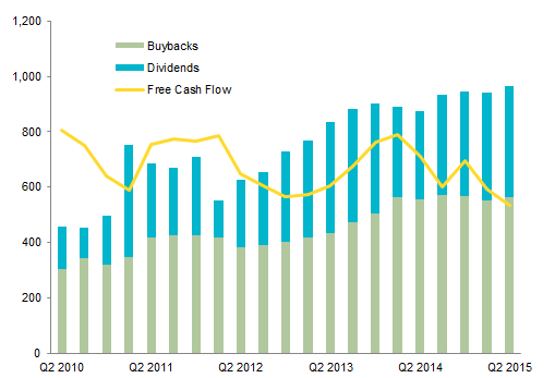 Growth in the dollar value of share buybacks for US large-cap companies has stalled, but cash dividends increased further in second quarter even as free cash flow declines (falling profit margins are overwhelming capital expenditure cuts)