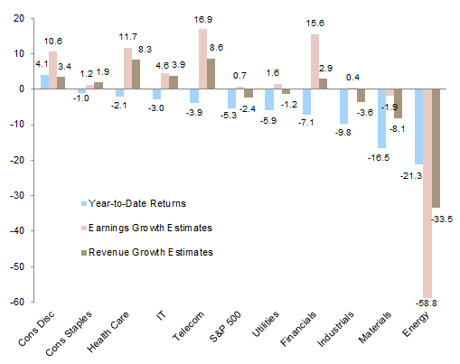 US equities (-6.4%) outperformed their international equivalents as second quarter results were slightly better than feared, and recent share repurchase and dividend activity suggested that cash allocation policies will continue to support stock market performance, at least in the near term. Large caps outperformed small caps, with large-cap growth stocks proving the most resilient in the recent down market, perhaps a signal of quality returning to favor. From a sector standpoint, the utilities sector outperformed and was the lone positive performer on the quarter, while energy and materials stocks suffered large losses. Health care stocks also underperformed amid rising political scrutiny of pharmaceutical pricing practices. Comparing year-to-date sector performance with the latest earnings and revenue growth expectations, it’s clear that fundamentals are at least partly driving return dispersion among sectors. Except financials, the sectors that have outperformed this year are those where growth expectations for both earnings and revenues have remained positive. The top performing sectors (consumer discretionary, consumer staples, and health care) also happen to be the most tied to the domestic economy. At the same time, these sectors are generally where valuations are most stretched today.