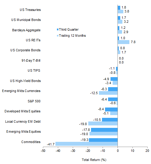 Market volatility notably increased in the third quarter, largely driven by investors’ growing concerns over China’s slowing economy and the negative implications for global growth, inflation, and asset prices. The US Federal Reserve’s decision to continue holding rates at the zero bound, citing China-related developments, further contributed to the market’s uncertainty. Since late May, global equity markets have been in the midst of a full-fledged correction, which to date has been the worst period for equities since 2011. Fears over the impact of China’s slowdown on global trade caused commodities, natural resources equities, and emerging markets stocks to experience the largest declines of the quarter. Energy master limited partnerships (MLPs) suffered their worst losses on record, punished by markets drawing a perhaps misplaced connection between lower oil prices and distribution cuts. In contrast, investment-grade bonds generated gains despite historically low yields and outperformed equities by a wide margin.