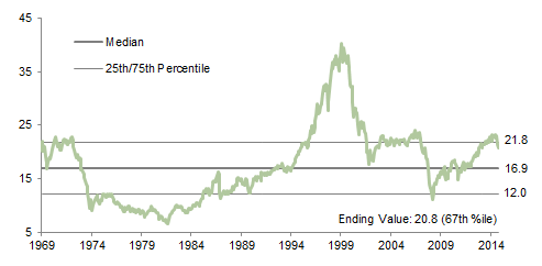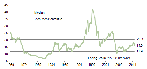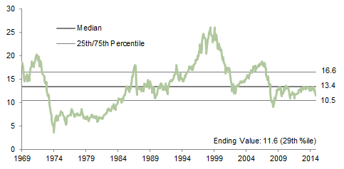 The composite normalized P/E ratio is calculated by dividing the inflation-adjusted index price by the simple average of three normalized earnings metrics: ten-year average real earnings (i.e., Shiller earnings), trend-line earnings, and return on equity–adjusted earnings. We have removed the bubble years 1998–2000 from our mean and standard deviation calculations. All data are monthly.