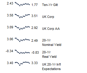 UK sterling fixed income yields reflect the BofA Merrill Lynch Sterling Corporate AA Bond Index, BofA Merrill Lynch Sterling Corporate Bond Index, UK ten-year gilts, and Bank of England 20-year nominal, real, and zero coupon (inflation expectations) yields.