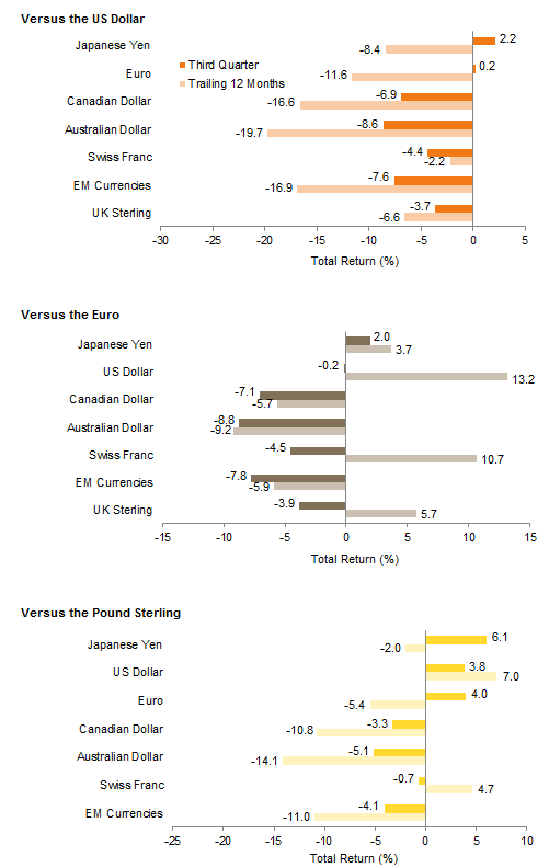 The dollar weakened against the yen and was flat against the euro in third quarter, while resuming its appreciation against emerging markets and developed commodity producer currencies. The dollar strengthened versus the Swiss franc and pound sterling over both the quarter and the trailing 12 months. The ECB’s QE policy has successfully weakened the euro against the pound, Swiss franc, US dollar, and yen on a trailing 12-month basis. Emerging markets and commodity currencies have depreciated versus the euro over the same time period, particularly in the third quarter. The pound weakened versus the yen, dollar, and euro in third quarter, while remaining relatively flat versus the Swiss franc. Over the trailing 12 months, the pound depreciated versus the dollar and franc but showed relative strength against other currencies