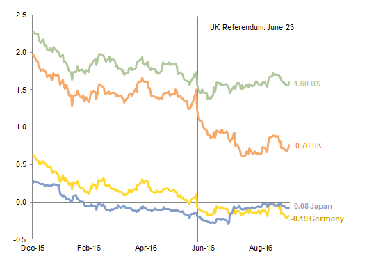 Government bond yields in key markets touched record lows during the quarter; the economic uncertainty caused by the “Brexit” vote, combined with the BOE’s decision to reinstitute quantitative easing, drove a particularly sharp decline in gilt yields