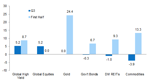 Notes: Returns are denominated in local currency terms. Gold return is the change in spot price. Asset classes represented by: Bloomberg Barclays Global High Yield Bond Index (Global High Yield), MSCI All Country World Index (Global Equities), J.P. Morgan Global Government Bond Index (Govt Bonds), FTSE® EPRA/NAREIT Developed REITs (DM REITs), Bloomberg Commodity Index Total Return (Commodities). Global equities and DM REITs returns are gross of dividend taxes.