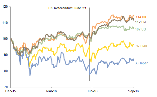 Eurozone (6.6%) and Europe ex UK (5.1%) equities were led by Germany (8.8%), Spain (8.1%), and the Netherlands (8.0%) and outperformed developed markets as a whole. The results of the European Banking Authority’s stress tests revealed that most banks have made progress raising capital and shoring up balance sheets since the last round of bank examinations in 2014. Still, the quarter ended with German lender Deutsche Bank capturing headlines as its share price plunged amid news of a potentially large settlement with the US Department of Justice over the bank’s misdeeds underwriting mortgage-related securities prior to the global financial crisis. Despite the recent sell-off in Deutsche Bank’s stock and subordinated bonds, most analysts believe the bank’s issues are ones of capital adequacy and not liquidity, which would explain why the share prices of other European banks have not succumbed to similar pressures in recent weeks.