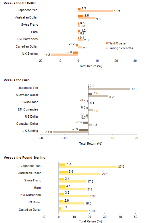 The US dollar weakened against several developed markets currencies and versus an equal-weighted basket of emerging markets currencies. The British pound was the main exception, falling 2.8% against the greenback over the quarter after an 8.2% drop in June. The pound sterling weakened against every major currency and most emerging markets currencies for the quarter and has depreciated against every global currency we track for the year-to-date and trailing 12-month periods. The euro appreciated against the UK sterling, Canadian dollar, US dollar, an EM currency basket, and Swiss franc but fell vis-à-vis the Japanese yen and Australian dollar; the latter enjoyed broad strength, having benefited from the rebound in industrial metals prices. Within emerging markets, the South African rand and Korean won were particularly strong; the Mexican peso was notably weak in contrast as Donald Trump’s candidacy has stoked concerns that Mexico’s trade agreements with the United States would be at risk were he to win the US presidency.