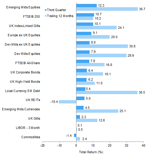 EM equities and UK mid caps outperformed other assets for the quarter in pound sterling terms. The UK pound’s further weakness meant that developed markets equities outperformed broad UK equities. UK linkers experienced their best quarter on record and also outperformed domestic equities. UK gilts also gained but meaningfully trailed UK investment-grade and high-yield corporate bonds, which rallied as the BOE announced they will be included in its new round of asset purchases