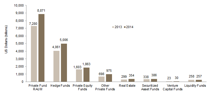 According to the SEC staff report, more than 2,600 advisers filing Form PF managed more than 21,500 funds representing $8.871 trillion in regulatory assets under management (RAUM).[5]RAUM are the gross value of assets, and in the case of private equity funds include unfunded commitments. This places the private funds industry at just over half the size of the US mutual fund industry[6]According to the Investment Company Institute’s Investment Company Factbook from May 14, 2014, the North American mutual fund industry had $15 trillion under management while $30.0 trillion was … Continue reading and represents an increase of more than $1 trillion in RAUM over 2013 Form PF Report levels (Figure 2).