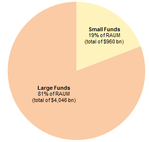 Assets remain significantly concentrated in the largest funds. This year, more than 6,400 hedge funds with RAUM under $500 million reported to the SEC. These represented only 19% of hedge fund assets while 1,326 larger funds (only 17% by number of the funds reporting) represented 81% of RAUM (Figure 3).
