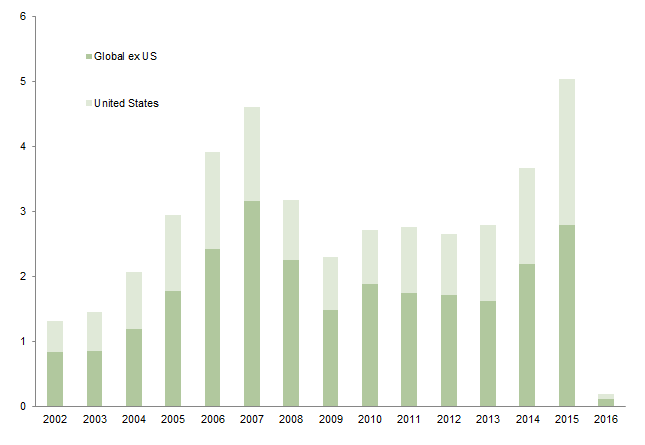 Following 2014, when merger & acquisition (M&A) activity posted its largest deal value since the 2007 peak, 2015 saw a record-shattering $5.04 trillion worth of global M&A,[2]According to data provided by Dealogic. which easily surpassed the $4.61 trillion in 2007. M&A activity was robust around the world in 2015; while the United States represented roughly half of announced activity, its peak to date, the Asia Pacific region also exceeded $1.0 trillion for the first time in history. A key factor in the surging activity was the record number of mega-deals—mergers of $10 billion or more—which totaled 69 and represented $1.9 trillion in value. Deals of this size allow even those managers with the largest asset bases to invest: the deals are typically liquid due to the large market capitalizations, and have more attractive spreads given their increased complexity and tendency to cross borders. Non-M&A corporate activity also spiked: companies executed massive share buybacks, activism continued to surge, and spin-offs reached record numbers.